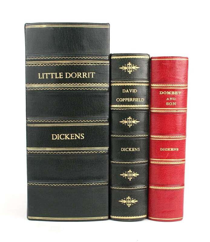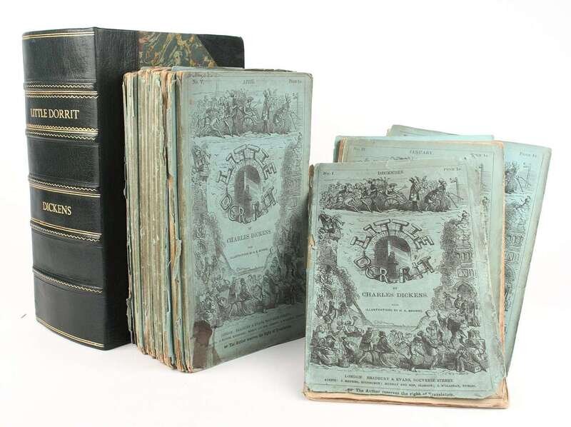 Dickens, Charles: Little Dorrit. London: Bradbury & Evans, 1855-1857. 1st ed, 1st issue, orig parts. 20 parts in 19. 8vo, orig blue wrappers. Illus by H.K. Brown, 40 plates (incl dark plates); plates moderately to heavily foxed. With errata slip in part 16. Lacking advts in parts 2-4, upper fore-edge corner of Morisonian slip in part 6 torn away, lacking back wrapper for part 16, several other wrappers detached but present, a few spines chipped away. Other scattered wear. In custom fall-down 3/4 morocco box. Hatton & Cleaner pp 307-330. * The Personal History of David Copperfield. London: Bradbury & Evans, 1850. 1st ed in book form, first state. 8vo, modern 3/4 crushed green morocco & marbled bds, gilt, raised bands. Untrimmed. Illus by Phiz (H.K. Browne), 40 plates (incl vignette title plates). Spotted & dust smudged, often creased & chipped. Small old repairs to verso of frontis. * Dombrey and Son. London: Bradbury & Evans, 1848. 1st ed in book form. 8vo, modern 1/4 scarlet morocco & marbled bds, spine gilt, raised bands. Illus by H.K. Browne, 40 plates (incl vignette title); moderate spotting & dust smudging.