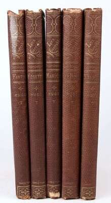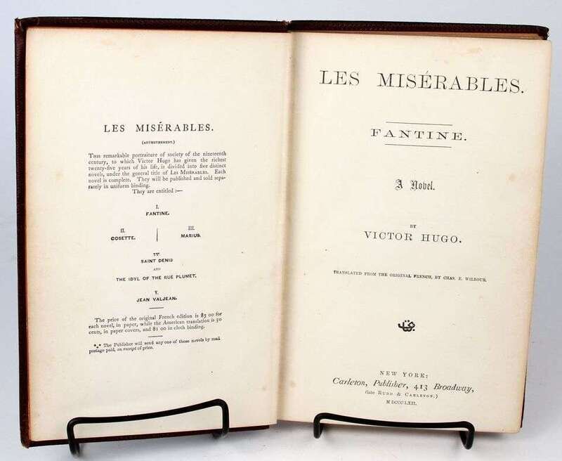 Hugo, Victor. Les Miserables. New York: Charleston, 1862. 1st American ed. 8vo, orig dark purple cloth, spine gilt; light wear, corners slightly bumped, joints a little scuffed, heads & feet of spines frayed & mostly just slightly chipped, 7mm chip at foot of "Marius" spine. 4pp advts at back of "Fantine" & "Cosette," 2pp advts at back of "Maris" & "Jean Valjean." Ownership signature dated Dec 30, 1862 on front free endpaper recto. Tight, attractive set.