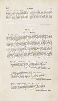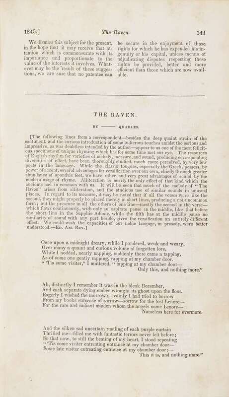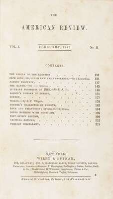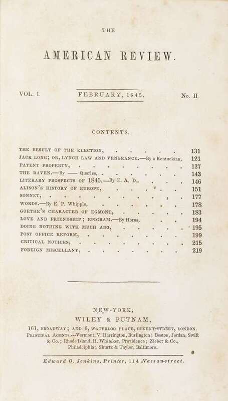 [Poe, Edgar Allan.] "The Raven." The American Review: A Whig Journal. New York: Wiley & Putnam, Feb 1846. Vol 1, No 2. Contemp pub 1/4 sheep & marbled bds; spine & corners rubbed, but sound. Scattered light foxing.