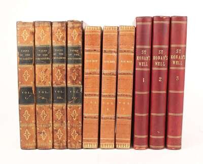 [Scott, Sir Walter]: Rob Roy. Edinburgh: Printed by James Ballantyne for A. Constable & Co. [et al.], 1818. 1st ed. 3 vols. Sm 8vo, contemp 1/4 calf & marbled bds; rubbed, rebacked, new endpapers. With half and bastard titles. * St. Ronan's Well. Edinburgh: For A. Constable & Co. [et al.], 1824. 1st ed. 3 vols. 8vo, late 19th-century 3/4 purple calf & marbled bds, spines gilt; extremities scuffed. With half & bastard titles. * Tales of the Crusders. Edinburgh: A. Constable & Co. [et al.], 1825. 1st ed. 4 vols. 8vo, contemp 3/4 calf & marbled bds, gilt, morocco spine labels; scuffed extremities, rubbed. Light to moderate foxing. With bastard titles. Scattered minor internal spotting, unless otherwise noted.