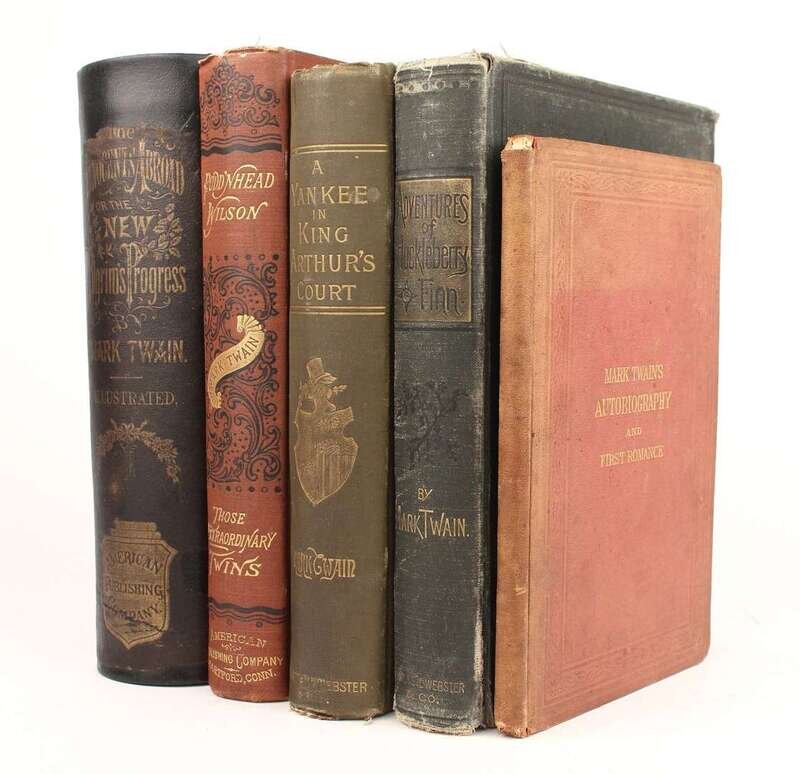 (Twain, Mark.) Clemens, Samuel: The Innocents Abroad. Hartford, 1869. 1st ed, 1st issue. 8vo, orig black cloth, gilt, rebacked, much of orig spine rebacked. With 2 frontispieces + 14 plates. 5pp advts at back. Lacking fly leaves, new brown endpapers, repair to verso of 1st frontis. BAL 3316. * Mark Twain's (Burlesque) Autobiography. New York, [1871]. 1st ed, 2nd state. 8vo, orig gilt-lettered terra-cotta cloth; moderate wear. Illus. Some internal spotting & dust smudging. BAL 3326. * The Adventures of Huckleberry Finn. New York, 1885. 1st American ed. 8vo, orig pictorial green cloth, gilt; joints & spine ends rubbed, other moderate wear. Frontis, portrait, illus. Title is cancel, but preponderance of late issue points. * A Connecticut Yankee in King Arthur's Court. New York, 1889. 1st ed. 8vo, orig pictorial green cloth, gilt; corners bumped, joints rubbed. Fronits, illus, 2pp advts. Late state, without fly title. BAL 3442. * The Tragedy of Pudd'nhead Wilson. Hartford, 1894. 1st American ed, 2nd state. 8vo, orig terra-cotta cloth, gilt; slightly scuffed, light edge wear. Frontis, illus. Bookplate removed from front paste-down. BAL 3442.