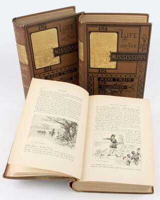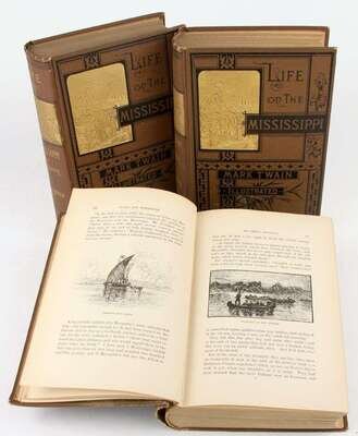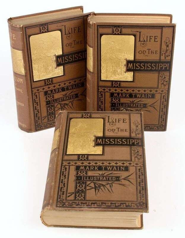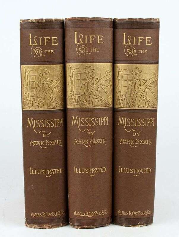 (Twain, Mark.) [Clemens, Samuel L.] Life on the Mississippi … by Mark Twain. Boston: James R. Osgood, 1883. 1st American ed, 1st state. 8vo, orig black-stamped & gilt pictorial brown cloth; spine ends & corners a little frayed. Frontis, illus. Bright, attractive copy. BAL 3411, 1st state intermediate B (A?) - without tailpiece on p411, with "St. Louis Hotel" on p443. * 2 copies of the second state of the preceding. Orig cloth; light to moderate wear, but bright copies.