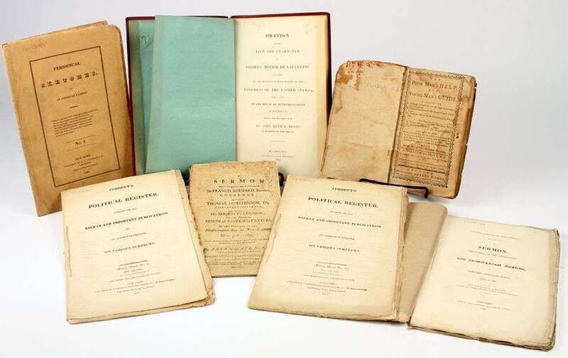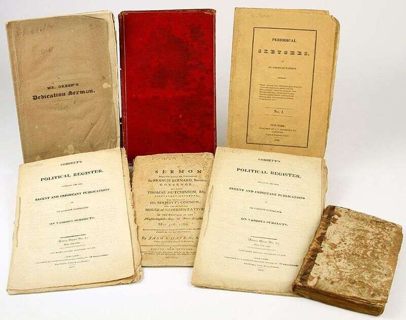 Americana - 18th- & Early 19th-Century Imprints: Haven, Jason. A Sermon Preached Before His Excellency Sir Francis Bernard ... Boston: Richard Draper, 1769. 8vo, sewn, unbound, (3)-46 (of 55)pp, t.p. on (3). Some spotting. Evans 11289. * Burkitt, William. The Poor Man's Help and Young Man's Guide. New York: Robert Hodge, [1788]. 12mo, contemp (orig?) bds; worn. Some internal dampstaining. Lacking endpapers. [Bound with:] _ _. Forms of Prayer ... New York: R. Hodge, 1788. Evans 20990. * Corbett's Political Register. New York: 1817. "Extra Sheet[s] No[s] 1 & 2." 8vo, sewn self wrappers. Untrimmed. Clean. 2 copies. * [Dewitt, Charles Gerrit.] Periodical Sketches by an American Patriot. No 1. New York: A.T. Goodrich, 1820. 8vo, orig printed wrapper; old ink annotation at head of front wrapper. Some foxing. Untrimmed. American Imprints 1019 (2 locations). * Adams, John Quincy. Oration on the Life and Character of Gilbert Motier de Lafayette. Washington, 1835. 8vo, contemp red straight-grained morocco; occasionally rubbed. Edges of title-page discolored. American Imprints 29941. * Green, Samuel. A Sermon Preached at the Dedication of the Trinitarian Church in Concord Massachusetts, Dec 6, 1826. Concord: Allen & Atwill, 1827. 8vo, orig sewn printed wrappers; some creasing & spotting. Untrimmed. Scattered foxing. American Imprints 29066.