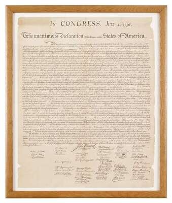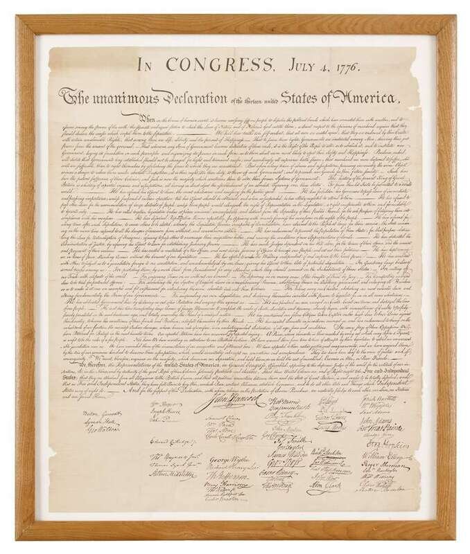 Engraved Broadside. "In Congress, July 4, 1776. The Unanimous Declaration of the Thirteen United States of America." N.p., [ca 1850-1875]. 31 x 24 3/4in; 787 x 628mm. Moderate creases along old folds, occasional chipping at edges, lightly toned, upper left blank margin darkened. Framed.