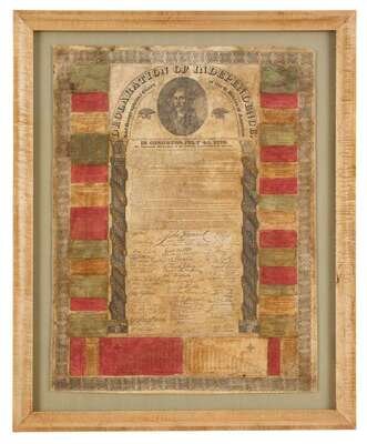 Hand-colored Engraving. "Declaration of Independence and Geographical Chart of the U. States of America." Philadelphia: Thomas Morrison, Dec 8, 1832. 27 x 20 1/2in; 685 x 520mm. Moderately toned & foxed, dampstaining to border & geographical chart, occasional moderate dust soiling, professionally repaired tears. Hinge mtd & floated in frame.
