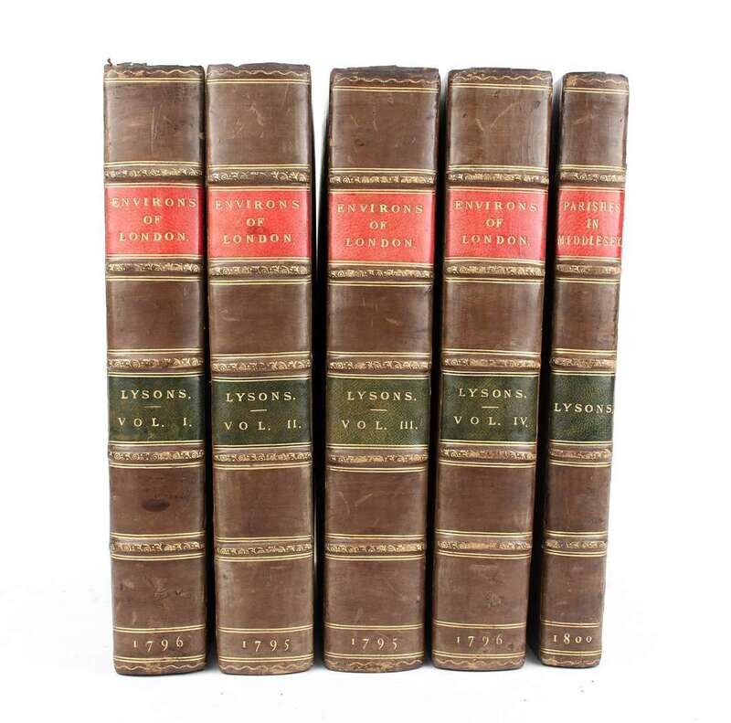 Lysons, Daniel. The Environs of London ... with ... An Historical Account of ... Middlesex ... London: A. Strahan for T. Cadell, Jun, and W. Davier, 1795-1800. 4to, contemp 1/2 calf & marbled bds & edges, gilt-decorated raised bands, green & russet morocco labels; occasionally scuffed, raised bands occasionally rubbed. Engraved plates, maps, pedigrees. Scattered, generally light foxing, edges of text & plates occasionally darkened. Complete, sound set.