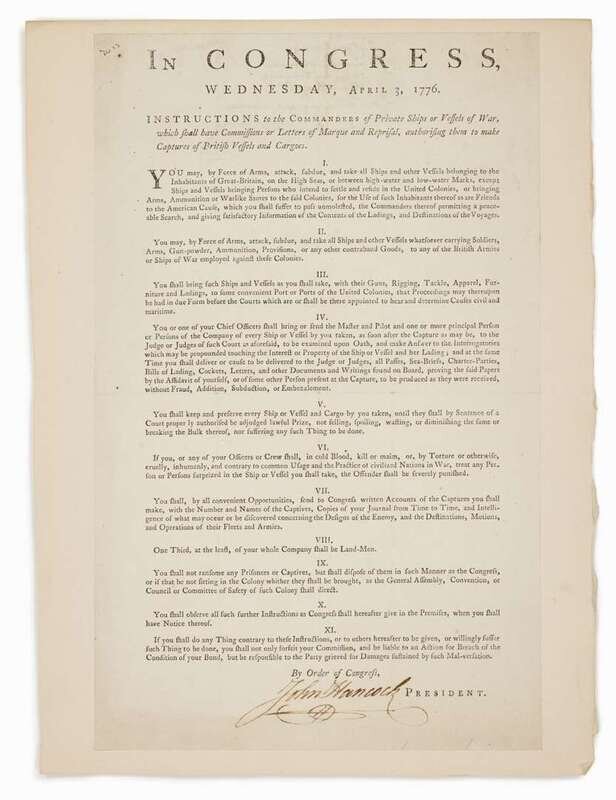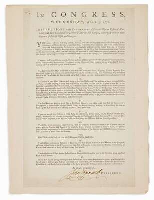 Document Signed. Hancock, John. [Philadelphia], Apr 3, 1776. Folio, 335 x 210mm, printed broadside, silked & window mtd. Authorizing the capture of British vessels & cargos by privateers. Signed as president of the Continental Congress. Light vertical creasing along old folds. Clean & attractive. Signature clear, bold & generally dark.