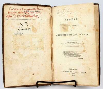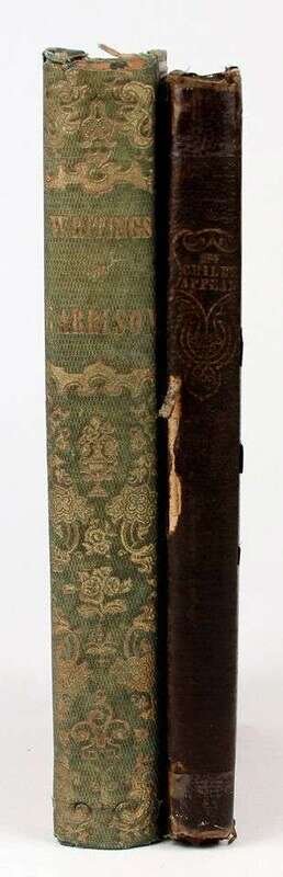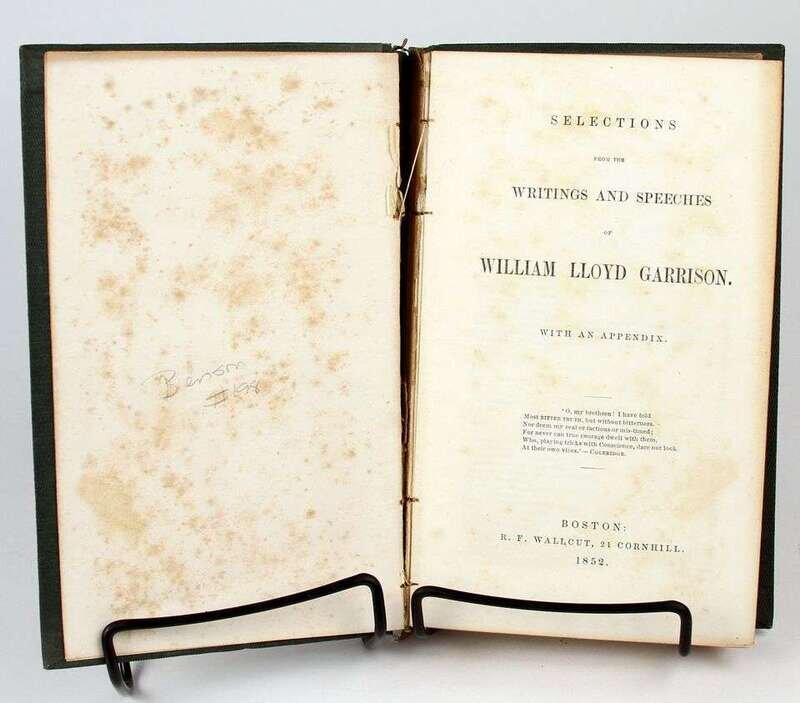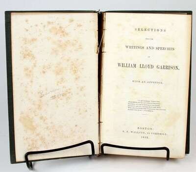 (American Abolitionists:) Garrison, William Lloyd. Selections from the Writings of ... Boston: R.F. Wallcot, 1852. 1st ed. 12mo, orig richly gilt gren cloth, t.e.g.; minor edge wear, slightly dusty. Front hinge broken. Scattered light foxing. Presentation copy, inscr to Margaret Hoopes & signed by Helen E. Garrison (William Lloyd's wife) on the front paste-down. * Child, [Lydia Maria]. An Appeal in [Favor] of That Class of Americans Called African. New York: J.S. Taylor, 1836. 1st ed. 12mo, orig cloth; spine repaired, other wear. Free endpapers removed. Light to moderate foxing, some wear on title page.