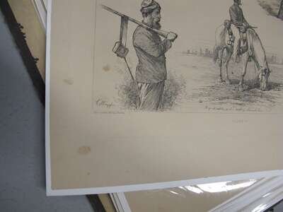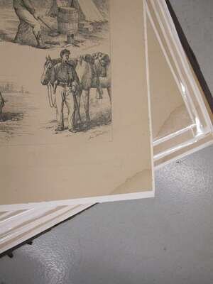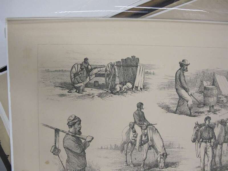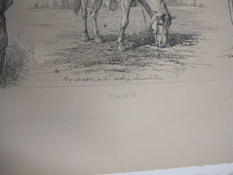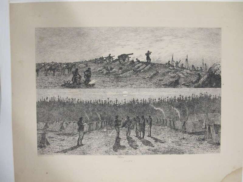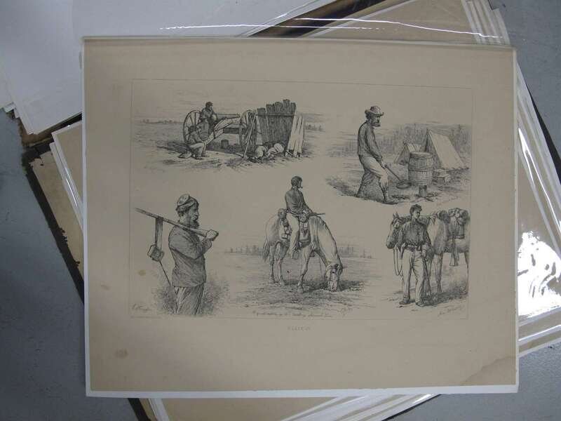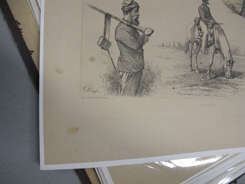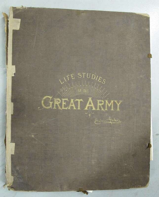 Forbes, Edwin. Life Studies of the Great Army. New York, [1876]. Folio, orig cloth; worn & crudely repaired, some dampstaining to endpapers. With 40 etched plates - proofs on tinted paper. Dampstianing to bottom right blank corners of plates. All loose in portfolio.