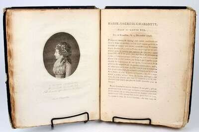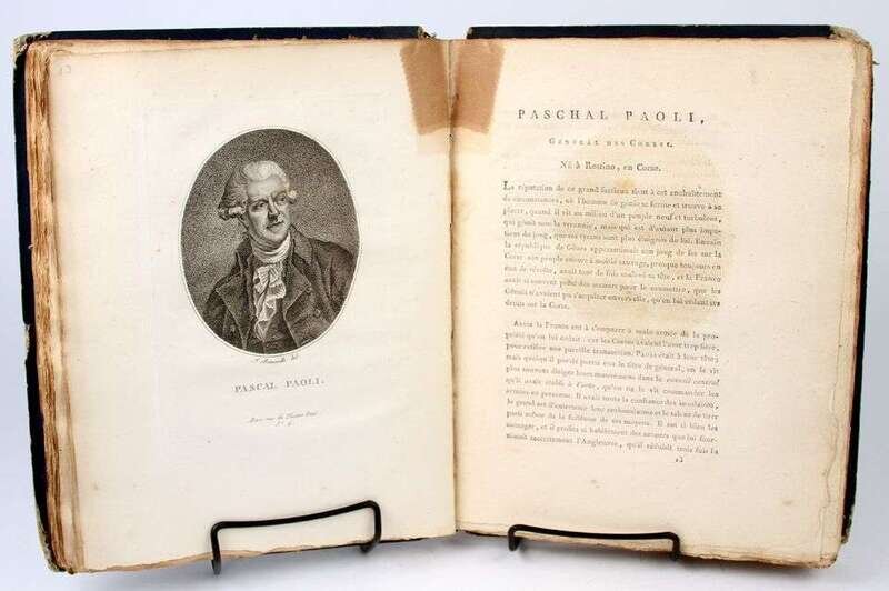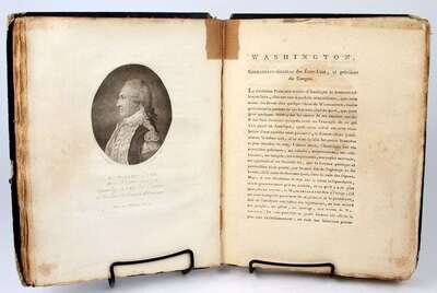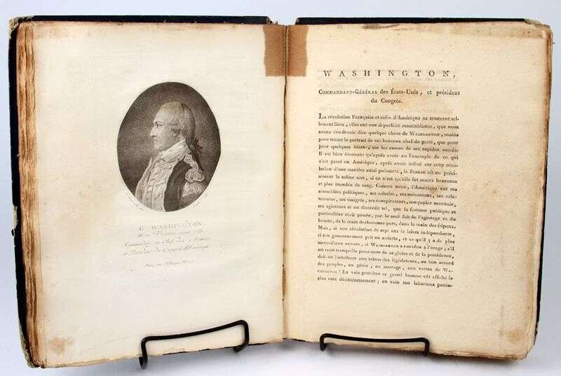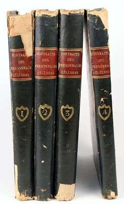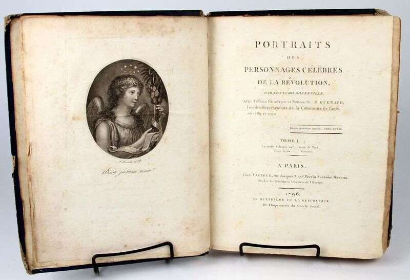 Quenard, P[hilippe]. Portraits des personnages celebres de la revolution. Paris, 1796. 4to, old (orig) blue bds, morocco spine labels; scuffed & worn, spines & labels partly worn away. With frontispieces + 200 portrait plates by F. Bonneville. Light to moderate offsetting on text from plates, scattered light to moderate foxing, dampstaining to upper fore-edge corners of vol 2. Untrimmed & partly unopened. Incl portraits of G. Washington, B. Franklin, Lafayette.