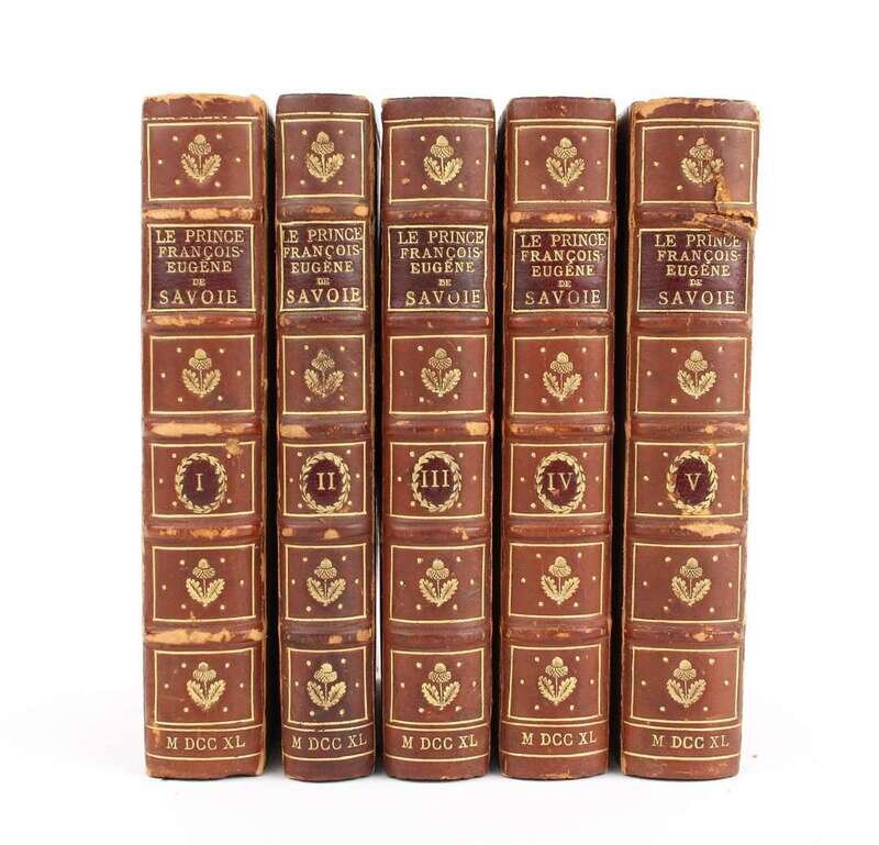 [Mauvillon, Eleazar de.] Histoire du Prince Francois-Eugene de Savoie. Amsterdam, 1740. Sm 8vo, 19th-century full tan calf, gilt; joints rubbed, several hinges cracked. With portrait & 8 fold plans, head & tail pieces. Vols 1-4 internally clean & crisp, vol 5 dampstained primarily in margins. Untrimmed, partly unopened.