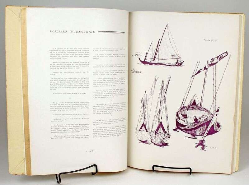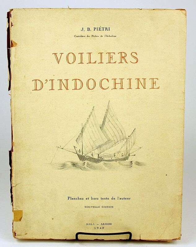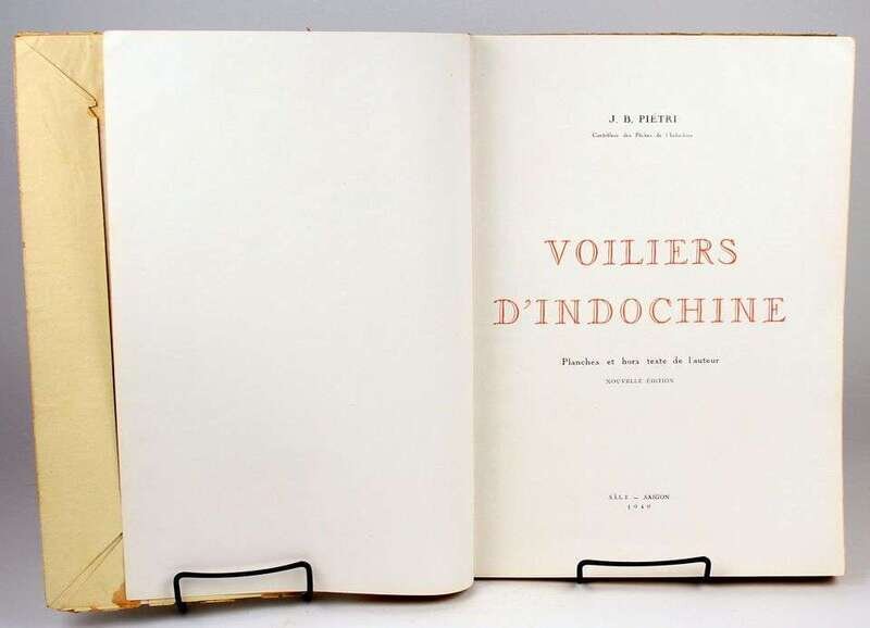 Pietre, J.B. Voiliers D'Indochine. Saigon, 1949. Nouvelle Edition. Folio, orig pictorial wrappers over flexible bds; chipping to spine. Map, color frontis + 70 tinted plates. Minor internal wear. Ex-library, label on spine, card on back bd.