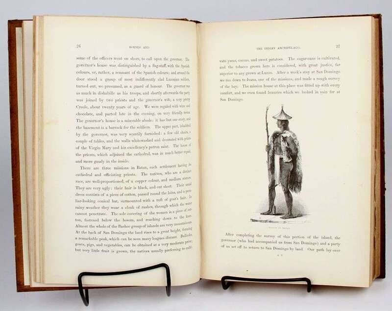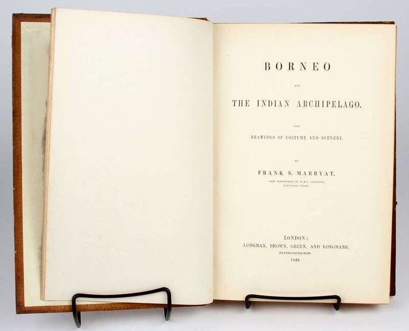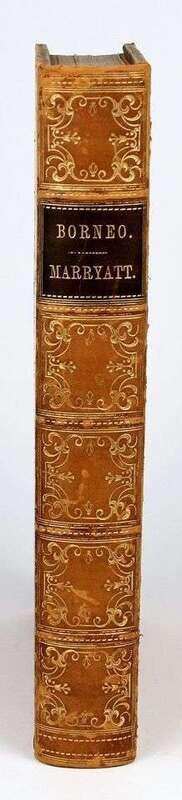 Marryat, Frank S. Borneo and the Indian Archipelago. London: Longman, Brown, Green, and Longmans, 1848. 1st ed. Tall 8vo, contemp full tan calf, spine gilt, morocco spine label; scuffed, joints & extremities rubbed. With hand-colored additional titles & frontis + 20 tinted litho plates, wood-engraved text illus. Light to moderate foxing to front & back matter, plate facing p6 rather foxed, plate facing p156 a little chipped in fore-edge margin. Endpapers discolored.