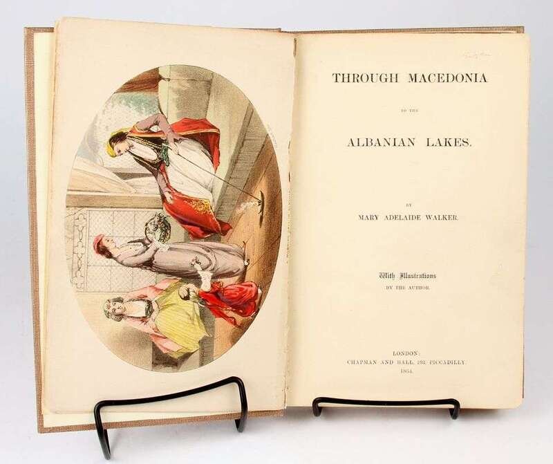 Walker, Mary Adelaide. Through Macedonia to the Albanian Lakes. London: Chapman and Hall, 1864. 8vo, modern buckram, morocco spine label. With 12 litho plates (4 colored, 8 tinted). Minor creasinf & a little dust smudging at bottom fore-edge corners, separation starting along frontis gutter.