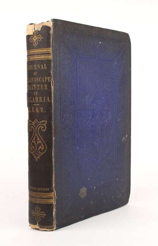 Lear, Edward. Journal of a Landscape Painter in Southern Calabria. (London:) Richard bently, 1852. 1st ed. Tall 8vo, orig blind-stamped blue cloth, spine gilt; head & foot of spine chipped, joints frayed & occasionally chipped, minor spotting, front hinge cracked. With 2 litho maps & 20 tinted litho views. Map facing title detached, partly dampstained, slightly chipped along fore-edge. With 4pp advts at back.