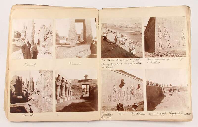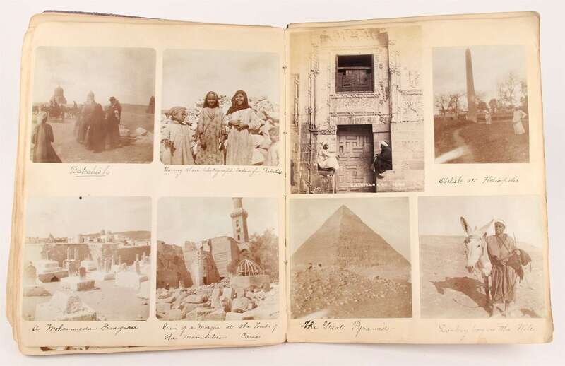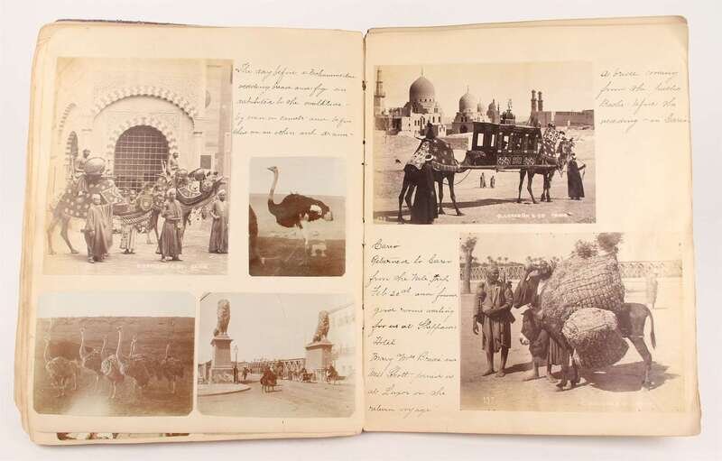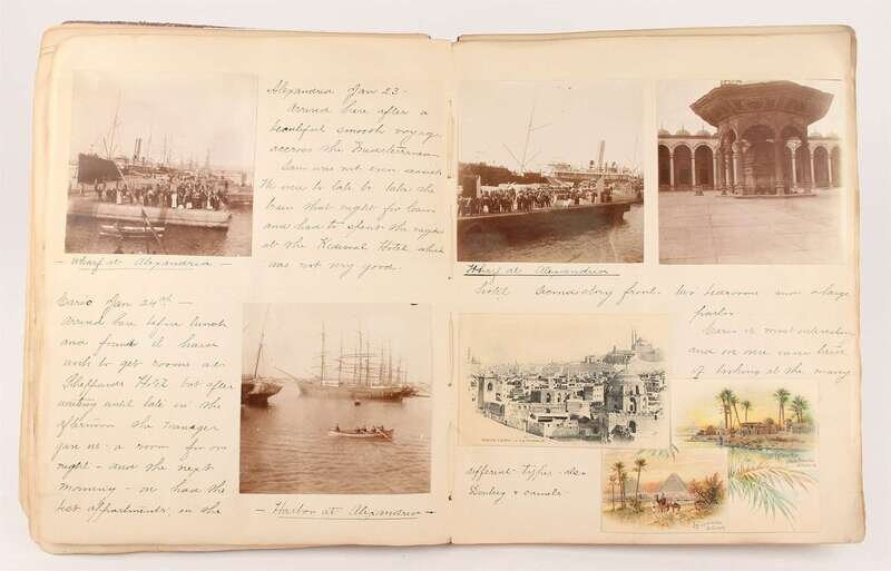 (Travel Diary.) Brown, Ellen S.Winter Trip Abroad. 1897-1898. 4to, orig flexible morrocco; worn & rebacked. 10pp with approx 200 mtd orig photos (amateur & professional); also mtd travel ephemera. [Philadelphia to New York]: England (incl. Bath); France (incl. Nice); Italy (Florence, Pisa, Rome, Naples, Pompeii); Egypt (incl. Alexandria, Cairo, Pyramids & other antiquities); Palestine (Jerusalem, Jericho); Greece, Constantinople & Budapest. Over 70 photos (mostly amateur) of Egypt; over 40 (mostly amateur) of Palestine. Mostly small format, includes hand-tinted commercial photos of Nice, charming ephemera.