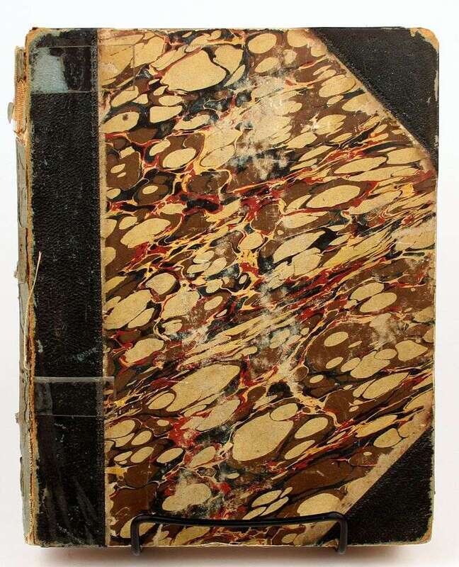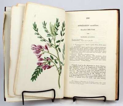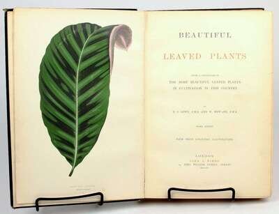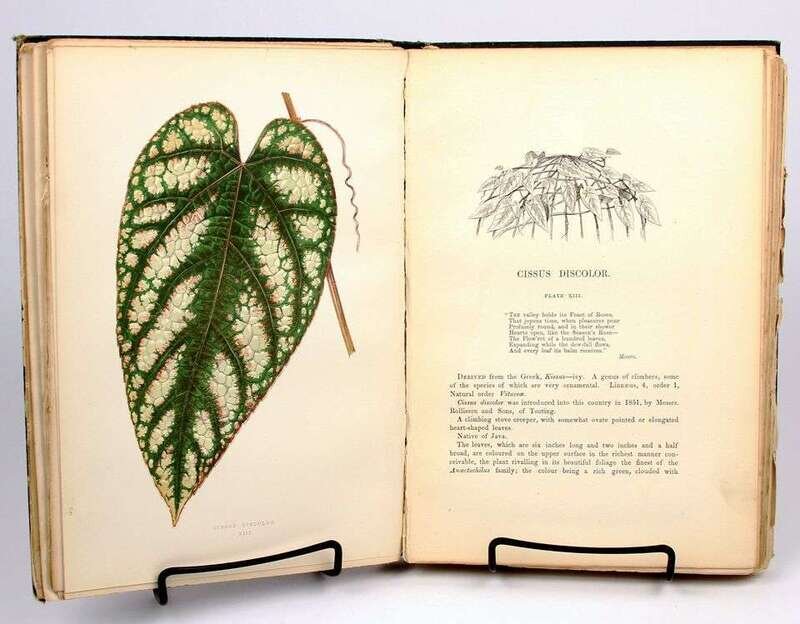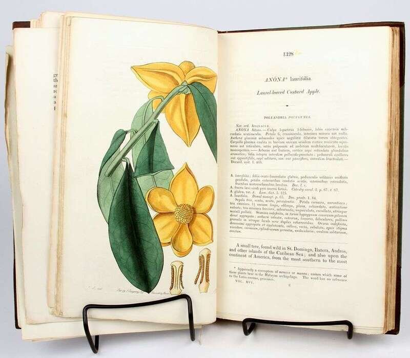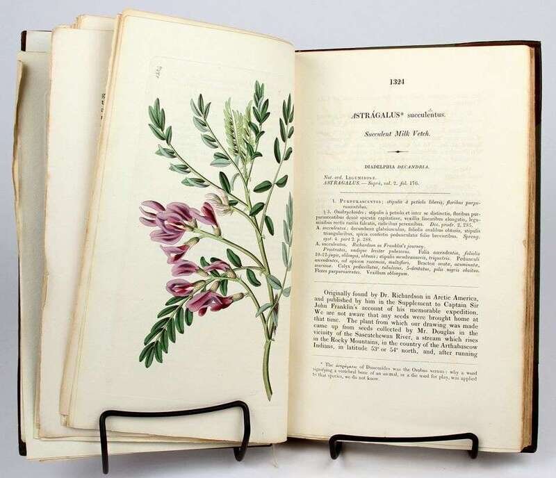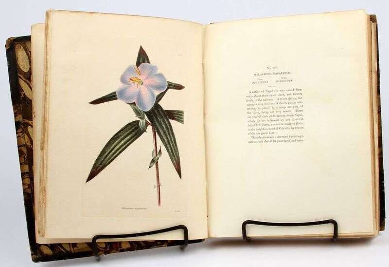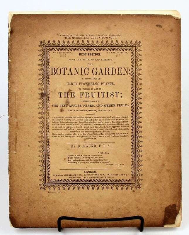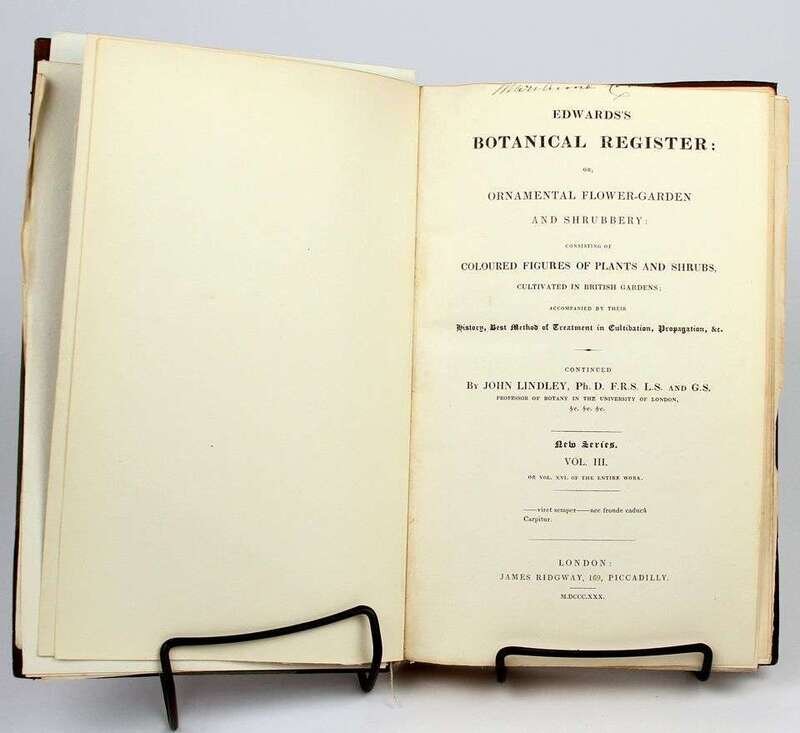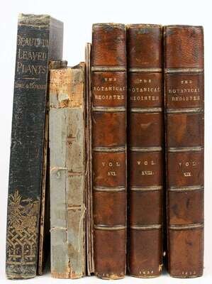 Hand-Colored & Chromolithographic Botanicals: Edward's Botanical Register. London: James Ridgway, 1830, 1832, [1833].Vols 16, 18-19. Tall 8vo, later 19th-century 3/4 morocco & cloth. Approx 185 hand-colored engraved plates, scattered light foxing, generally clean. * Cooke, George. The Botanical Cabinet. London, 1823. Vol 8. Sm 4to, bdg defective. 98 (of 100) hand-colored engraved plates. Some, mostly marginal dampstaining, light toning & minor offsetting from text. * Maund, Benjamin. The Botanic Garden. London, Feb - Apr 1849. Sm 4to, orig wrappers. Moderate wear & dust soiling to wrappers. 3 nos, 6 hand-colored illus. * Lowe, E.J.; Howard, W. Beautiful Leaved Plants. London: J.C. Nimmo, 1891. 4to, orig gilt pictorial green cloth; worn. Approx 60 chromolitho plates. Shaken, edge wear. Sold with all faults as a collection of plates.