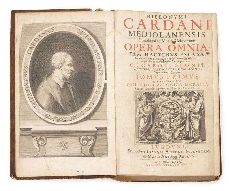 Cardano, Gerolamo.Hieronymi Cardani ... Opera Omnia. Lyon: 1663. 10 vols in 5. Folio, old calf; worn, rubbed & blistered. Titles in red & black. Light to moderate foxing. Ex-library.
