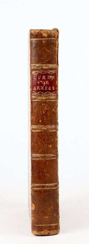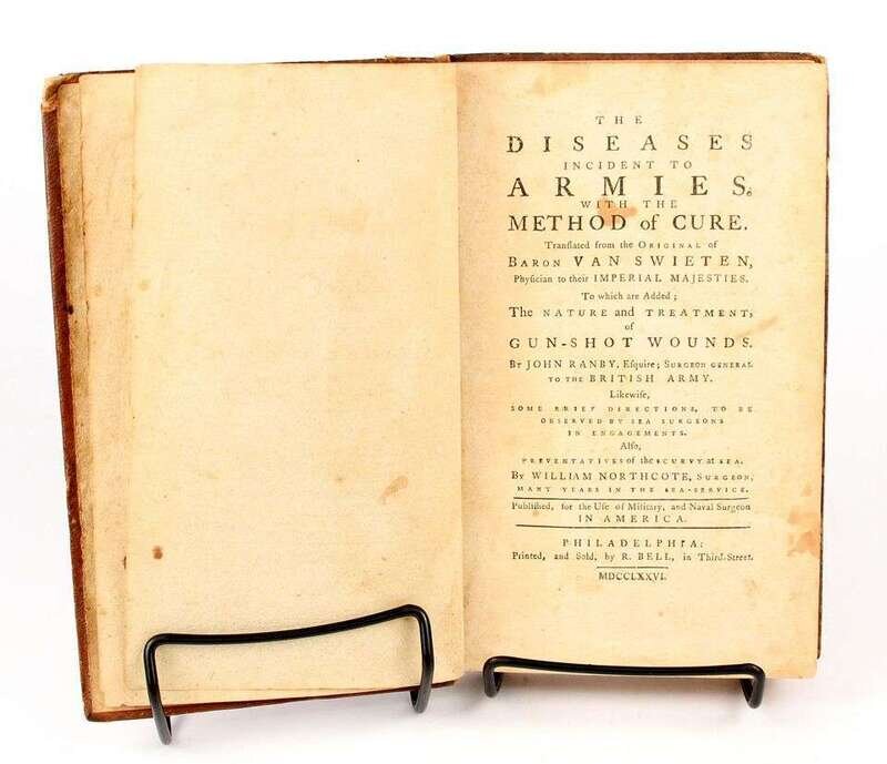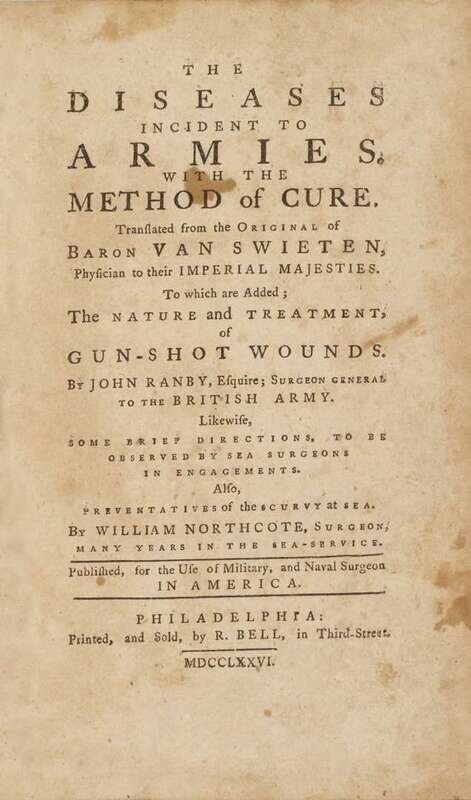 Swieten, Gerard L.B. van. The Diseases Incident to Armies with the Method of Cure. Philadelphia: R. Bell, 1776. 8vo, contemp sheep, gilt-ruled spine, red morocco spine label; moderately scuffed, corners, edges & joints rubbed, front joint starting to break. Some spotting to title & front matter, light foxing, very occasional minor marginal dampstaining. [Bound with:] Jones, John. Plain Concise Practical Remarks on the Treatment of Wounds and Fractures. Philadlephia: Robert Bell, 1776. 8vo, with 1p advts for medical books. Good margins in both titles. 18th-century bookplate of Charles Bensel.