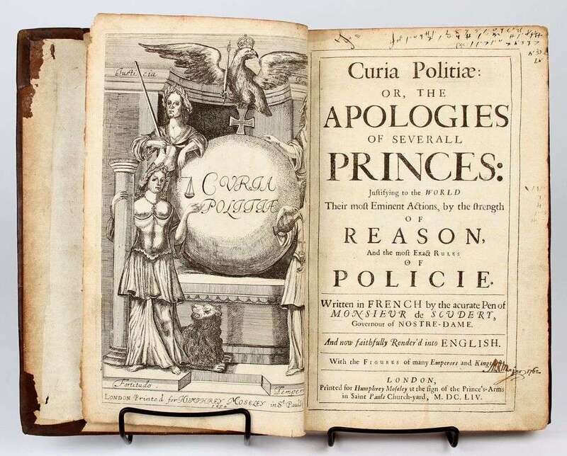 Scudery, [George de]. Curia Politiae: or The Apologies of Several Princes. London: Robert Boulter, 1654. 1st English ed. Folio, contemp calf, rebacked, orig endpapers. Frontis + 11 portrait plates. Old ink annotations on title & several shoulders. Minor internal wear.