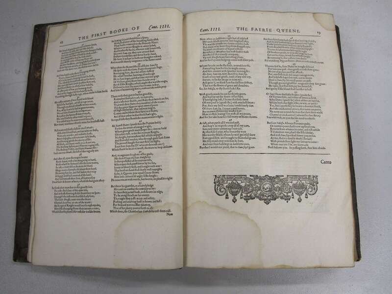 Spenser, Edmund. The Faerie Queen; The Shephard's Calendar; Together with the Other Works of England's Arch-Poet. [London]: H.L. for Mathew Lownes, 1611-1613. Folio, old (contemp) full blind-paneled calf, center cover gilt floral device, orange morocco spine label; scuffed, extremitites rubbed. Minor dampstaining at upper fore-edge of general title & first 80pp. Internally generally clean. With 2 front & 1 terminal blank, old ink signatures on front blank. 1st collected ed.