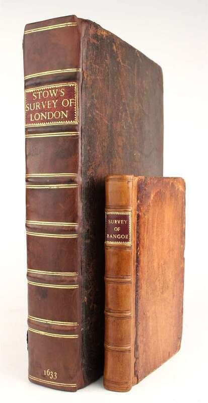 British Description & Travel: Stow, John. The Survey of London. London: Elizabeth Purslow, 1633. Folio, contemp paneled calf, rebacked, red morocco spine label, hinges repaired; scuffed. Small wounds to leaf [A1], edges of leaves darkened, scattered light foxing. Complete. STC 23345. * Willis, Browne. A Survey of the Cathedral Church of Bangor; and the Edifices Belonging to It. London: for Robert Gosling, 1721. 1st ed. 8vo, contemp calf, rebacked, red morocco spine label; extremities rubbed, new endpapers. 3 fold plates (frontis, plan, view). Internally generally clean, darkening to edges of last several leaves.