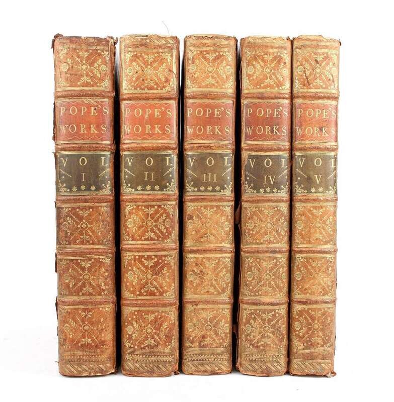 Pope, Alexander. The Works. London: for C. Bathurst, H. Woodfall, [et al.], 1769. 4to, contemp full calf, gilt-decorated spines, green & russet morocco spine labels; moderately scuffed, a few small blisters, joints tender. Engraved frontis portrait; light offsetting on title. Complete, tall, internally generally clean set in handsome period bdg.