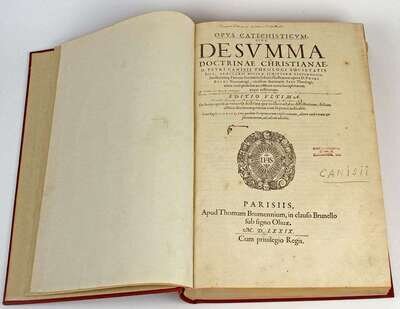 Cansius, Petrus. Opus catechisticum. Editio valtima. Paris: Thomam Brumennium, 1579. Folio, modern brick red buckram. Minor scattered internal spotting & very occasional marginal dampstaining, upper ofre-edge of several back index leaves creased & starting to tear. Lacking leaf OOO4 (terminal blank?). Ex-library, ink stamp on title-page.