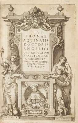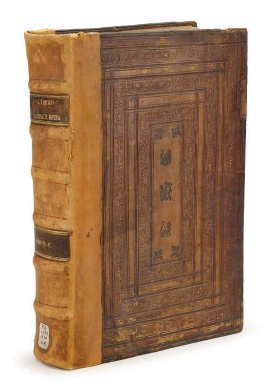 Thomas Aquinas, Saint. Opera Omnia. Rome: haeredes A. Bladi & I. Osmarinum Liliotum socios, 1570. 18 vols in 15. Folio, old tooled brown pigskin over wood bds, rebacked in old calf; rubbed. With engraved general title & separate col titles. Scattered light foxing. Ex-library, ink stamps on many titles & front matter.