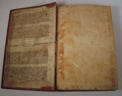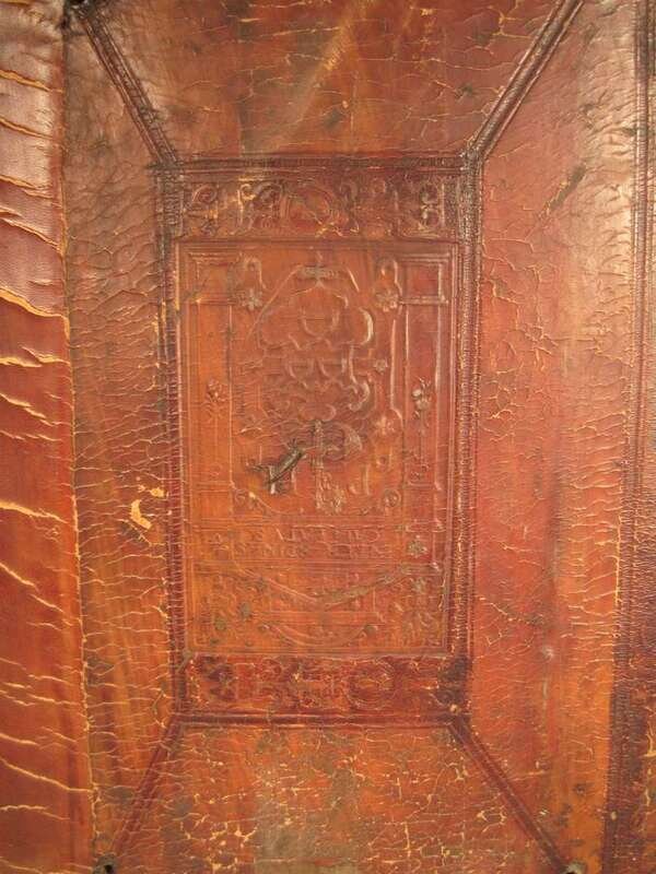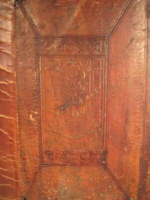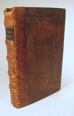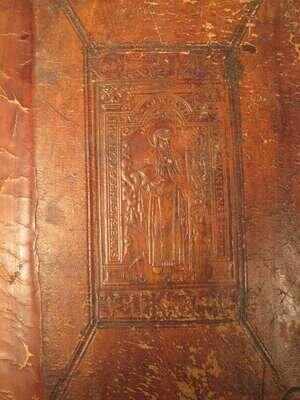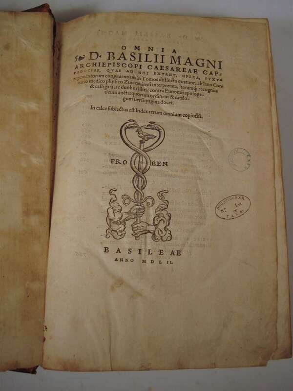 Basil the Great. Opera. Basel: Froben, 1552. Edited by J. Cornarius. Folio, old Flemish blind-stamped calf over wooden bds, the front centered by a panel of Saint Gertrude in an architectural frame, the rear panel a coat of arms of Philip Hosdin, dated 1557; rebacked, lacking clasps and studs, worn and scuffed. Decorated initials. Ink stamps to title page. Some dampstaining to lower gutter of rear matter and occasional discoloration, creasing to front matter. Text generally clean.