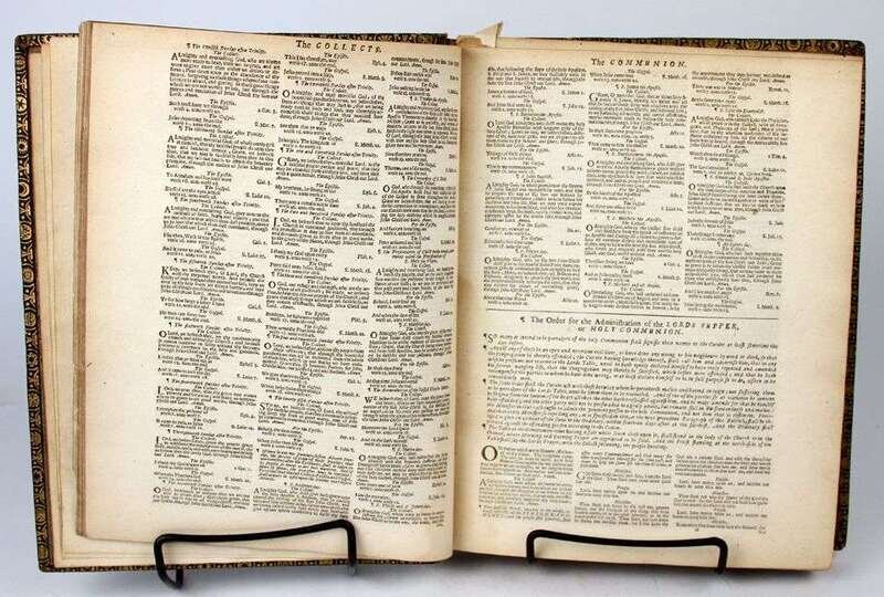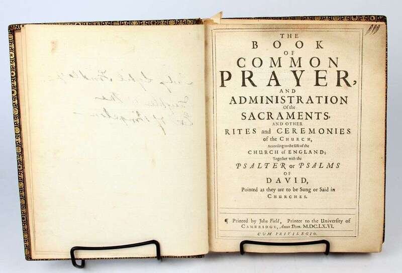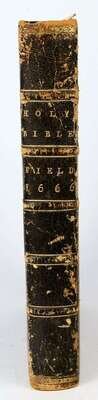 (Bible in English.) The Holy Bible Contating the Old Testament and the New. Cambridge: [John Field], 1666. 4to, 19th-century gilt-paneled full green morocco; scuffed, joints & extremities rubbed. With separate title-page for the New Testament: Cambridge: [John Field], 1666. [Bound With:] The Book of Common Prayer ... Cambridge: John Field, 1666. Engraved general title loose & with small old cellotape repairs to verso, head of title & front matter of the Book of Common Prayer moderately dusty, complete with Apocrypha. Trimmed, heads often shaved close - no loss of ptg. Known as "The Preacher's Bible."