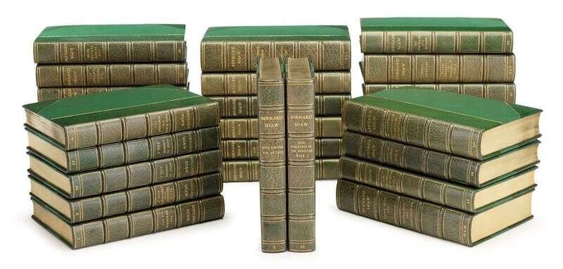 Shaw, George Bernard. The Works. London: Constable, [1930-1938]. #418/1000 (of 1025). 33 vols in 29. 8vo, contemp 3/4 crushed green levant & cloth, gilt, gilt-lettered & ruled spine compartments, gilt-decorated raised bands, by Sangorski & Sutcliffe; very occasionally, very slightly scuffed. Bright, attractive bdg.