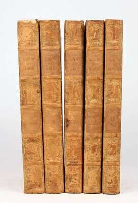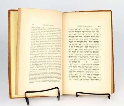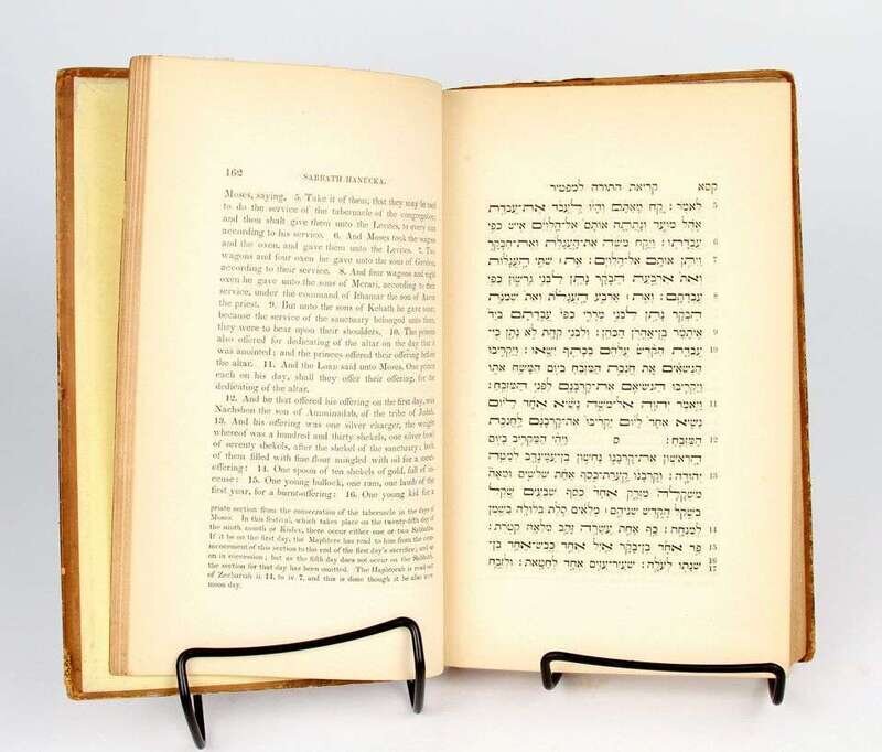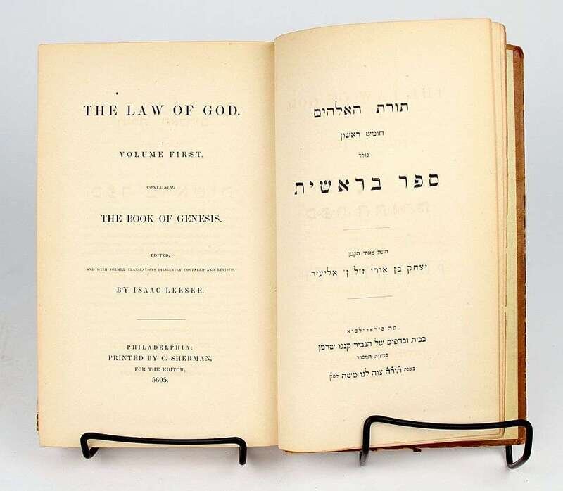 [Pentateuch.] The Law of God. Philadelphia: C. Sherman, 5605 [1845]. 1st ed. Edited by Isaac Usser. 8vo, contemp full tan calf; rather scuffed, spines, joints & extremities rubbed. Maroon morocco bookplates of Philip Nathans. Parallel English & Hebrew text. Complete. Tall, internally clean set.