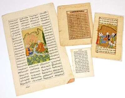 Islamic & Hebraic Manuscript & Printed Leaves: Persian manuscript, [ca 1800]. Later color, miniature, folio. * Persian ms leaf, from "Treatise on Astronomy," [ca 1500]. Sm 4to. * Hebrew ms leaf, [ca 1800]. With period? illuminated miniature. 12mo. * Printed Hebrew Bible leaf. Paris: Robert Estienne, [1544]. 110 x 70mm.