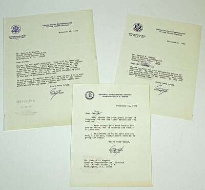 Typed Letter Signed. Bush, George: New York, Nov 6, 1972. 1p, 4to, on U.S. Rep to U.N. letterhead. * NY, Nov 28, 1972. 1p, 4to, on U.S. Rep to U.N. letterhead. * Wash, D.C., Feb 11, 1976. 1p, 4to, on CIA letterhead, signed as director. All to Gerald G. Wagner. Crisp & clean.