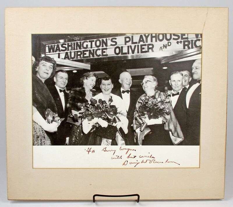 Photograph Signed & Inscribed. Eisenhower, Dwight D. [Washington, D.C., ca 1960.] Silver print, approx 10 1/2 x 13 1/4in; 265 x 335mm, matted & mtd. Inscr to Gerald G. Wagner & signed below image. Pictured with Mamie Eisenhower, Laurence Olivier & other cast members in front of theatre marquee.