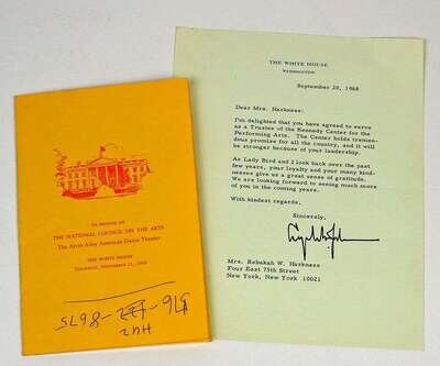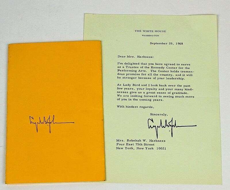 Autograph Material. Johnson, Lyndon B.: TLs. Washington, D.C., Sept 20, 1968. 1p, 4to, on White House letterhead. To Rebekah W. Harkness, welcoming her as a trustee of the Kennedy Center for the Performing Arts. light horizontal centerfold crease, signature dark & bold. * Program signed. "Alvin Alley American Dance Theatre, The White House,…" Nov 21, 1968. Folded 12mo, ptd in red on yellow (outer) & white (inner) stock, signed on back yellow outer fold. Both signed as president.