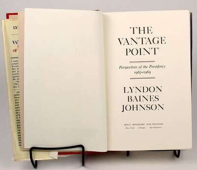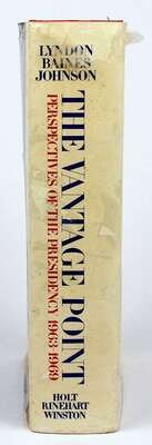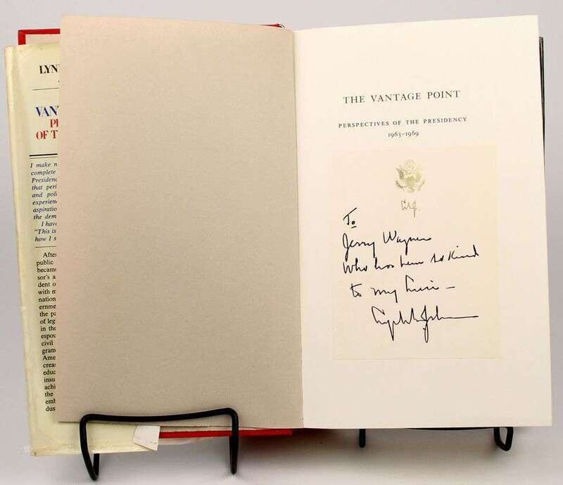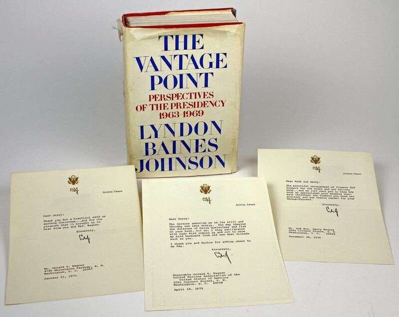 Autograph Material. Johnson, Lyndon B.: Austin, Dec 28, 1970. 1p, 4to. Initialed. To Mr. & Mrs. Gerry Wagner. * Austin, Jan 11, 1971. 1p, 4to. Initialed. To Gerald G. Wagner. * Austin, Apr 18, 1972. 1p, 4to. To Gerald G. Wagner. All on LBJ's gilt-decorated letterhead. * Johnson, Lyndon Baines. The Vantage Point. New York, etc, [1971]. 1st ed. 8vo, orig cloth, d/j (some creasing). With presentation presidential label warmly inscr & signed by Johnson to Gerry [Gerald G.] Wagner.