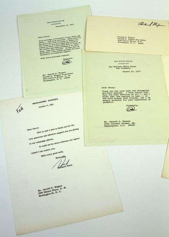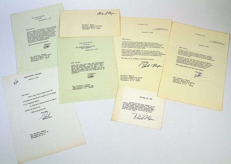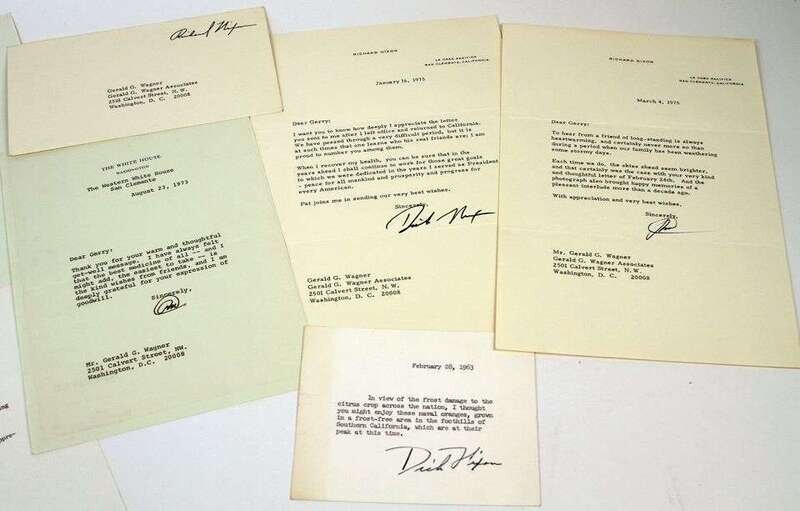 Typed Letters &C. Nixon, Richard: N.p., Oct 9, 1962. 1p, 4to, signed "Dick." * [California], Feb 28, 1963. Typed card with gift on California oranges. Signed "Dick Nixon." * San Clemente, Aug 23, 1973. 1p, 4to, on White House letterhead. * Wash, D.C., Nov 14, 1973. 1p, 4to, on White House letterhead. * San Clemente, Jan 16, 1975. 1p, 4to, on personal letterhead. * San Clemente, Mar 4, 1975. 1p, 4to, on personal letterhead. All to Gerald G. Wagner, expressing gratitude & friendship, the last 2 alluding to the aftermath of his resignation. Lot also incl Nixon free frank.