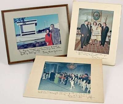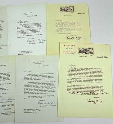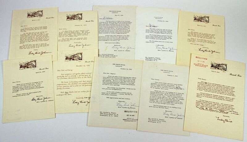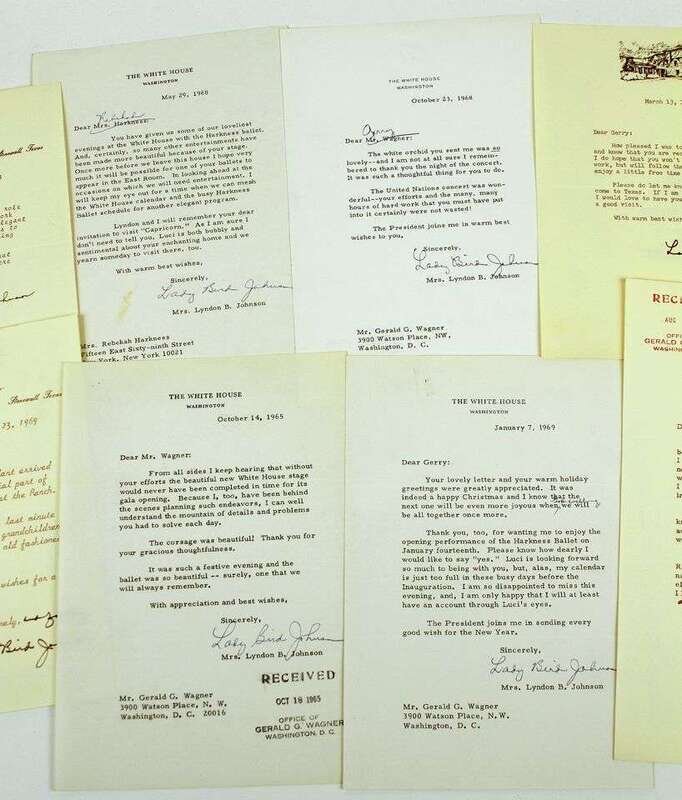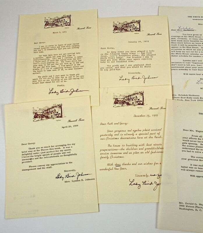 Autograph Material. Johnson, Lady Bird: Typed letter signed. Washington, Oct 14, 1965. 1p, 4to, on White House letterhead. * TLs. Wash, May 29, 1968. 1p, 4to, on White House letterhead to Rebekah Harkness. * TLs. Wash, Oct 23, 1968. 1p, 4to, on White House letterhead. * TLs. Stonewall, Dec 23, 1969. 1p, 4to. * TLs. Stonewall, Apr 26, 1969. 1p, 4to. * TLs. Wash, Jan 7, 1969. 1p, 4to, on White House letterhead. * TLs. Stonewall, Jan 29, 1973. 1p, 4to. * TLs. Stonewall, Mar 8, 1973. 1p, 4to. * TLs. Stonewall, Mar 13, 1973. 1p, 4to. * TLs. Stonewall, Jun 19, 1974. 1p, 4to. With ms interpolations. Orig color photo, inscr, signed & dated on mat, June, 1965. 9 1/2 x 7 1/2 in. * Color photo signed & inscr on mount. Nov 1, 1964. 7 1/2 x 9 1/2in. With stamped signature of Lyndon B. Johnson. * Color photo signed & inscr on mount. 7 x 9 3/4in. Framed. With the exception of TLs to Rebekah Harkness, all to Gerald G. Wagner. 13 pieces.