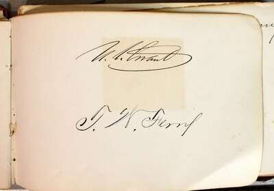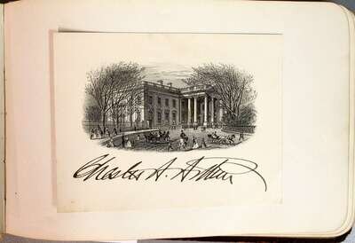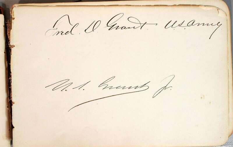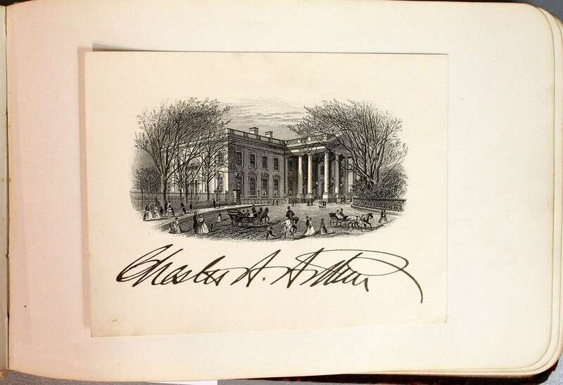 Autograph Album. Centennial Memorial, 1776-1876. Philadelphia, [1876]. Oblong 8vo, orig gilt pictorial leather; spine gone, front cover detached, bdg starting to break. Compiled 1876 - ca 1910. Primarily signatures of American political figures, incl: Grant, U[lysses] S. as president, Grant cabinet secrataries, 1876 members of Congress incl African-American representatives Jeramiah, Haralson & John Adams Hyman, Ulysses S. Grant, Jr., Frederick Dent Grant. Also presidential card signe dby Chester A. Arthur; signed & inscr, "Fifth Ave admis," by Edwin Booth.