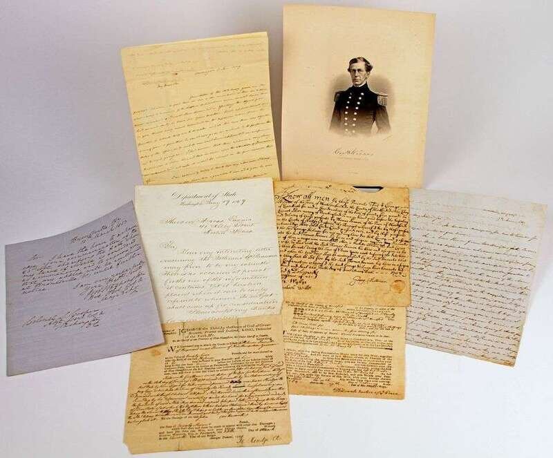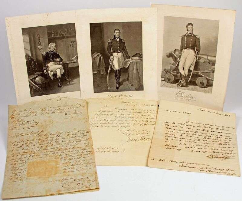 American Manuscript Material - Includes Military & Naval Figures: Barney, Joshua. Document signed. Baltimore County, Oct, 1789. 3pp, folio; some browning & creasing. Signed as witness. * Bainbridge, William. Autograph letter signed. Philadelphia, June 2, 1828. 1p, 4to; minor wear. * Brown, Jacob [Jennings]. Autograph letter signed. Washington, Apr 15, 1824. 1 p, 4to; minor wear. * Seward, Wm. H. Letter signed. Washington, Jan 19, 1869. 1 p, 4to; minor wear. * Washington, John A. Brensville. Virginia, Mar 10, 1853. 1 p, 4to; minor wear. Military leave. * Wilkes, Charles. Autograph letter signed. Washington, June 7, 1827. 2pp, 4to; minor edge wear. * Livingston, Edward. Autograph letter signed. Washington, June 17, 1824. 1 p, 4to; wound to integral leaf. * Lot also includes 3 18th-century New England documents (1 ms, 1708; 2 partly printed, 1770's).