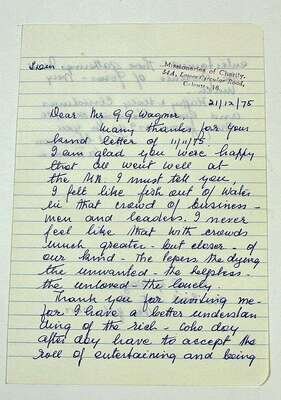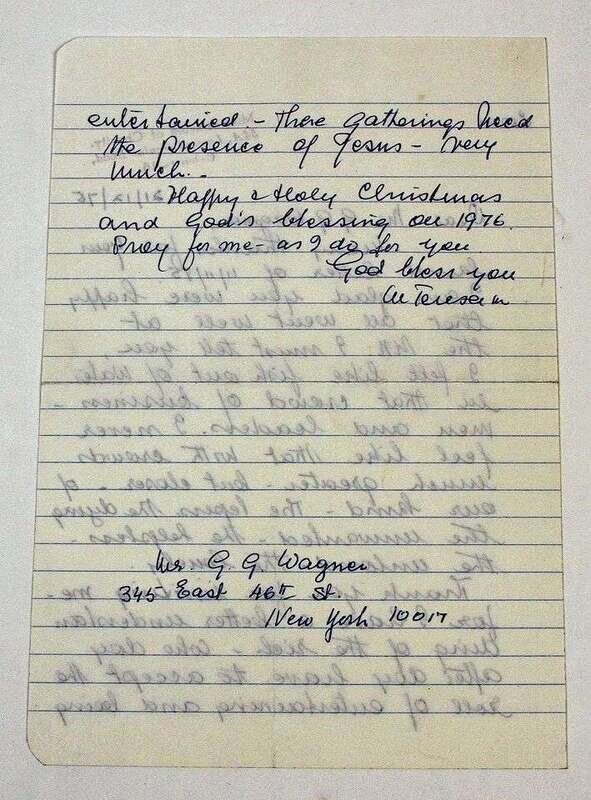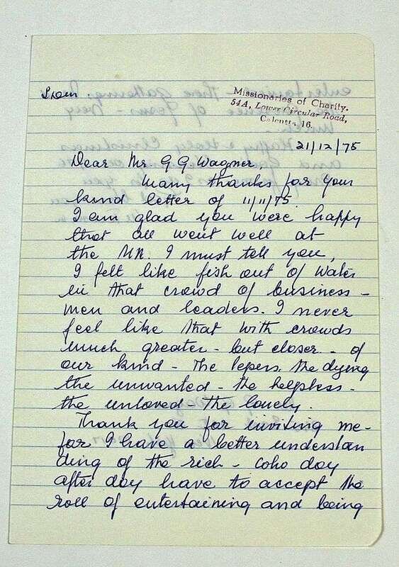 Autograph Letter Signed. Teresa, Mother Calcutta. Dec 21, [19]75. 1 1/2pp, 8vo. To G[erald] G. Wagner, thanking him for helping to conduct her appearance at the U.N., "I felt like a fish out of water in that crowd of … leaders. I never feel like that with crowds [of] lepers, the dying, the unwanted, the helpless, the unloved, the lonely.…" On lined white paper, Missionaries of Charity ink stamp. Light creasing but clean & clear.