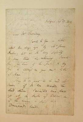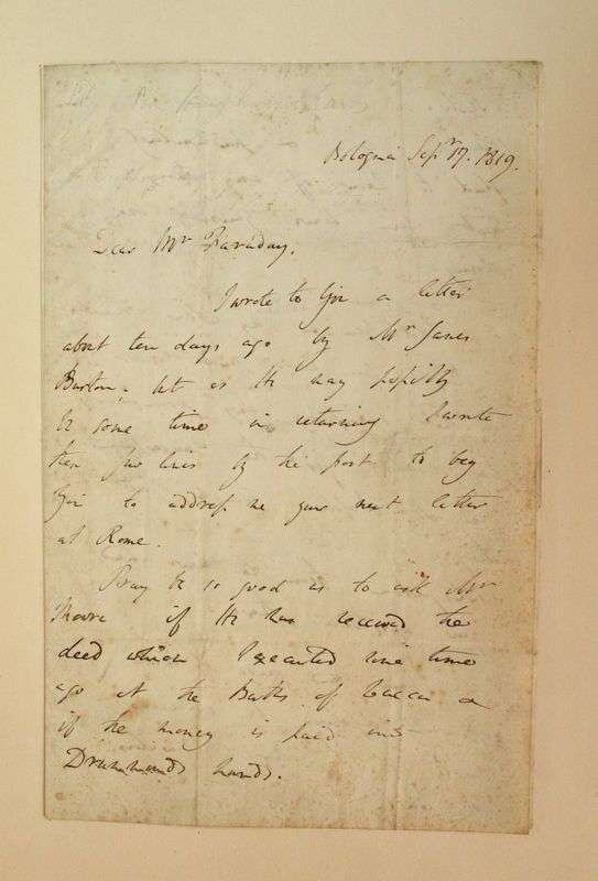 Autograph Letter Signed. Davy, H[umphry]. Bologna, [Italy], Sep 17, 1819. 3pp, 4to, with address leaf; light to moderate foxing. To Michael Faraday, Royal Institution, London. Friendly, collegiate letter touching on personal & professional (chemistry related) matters.