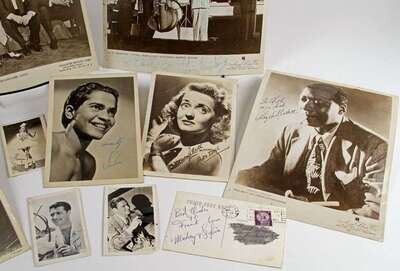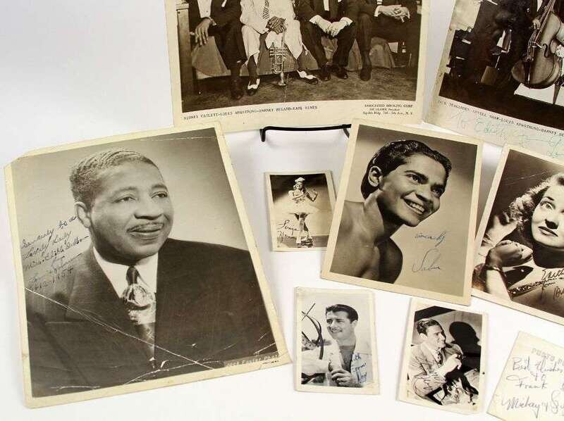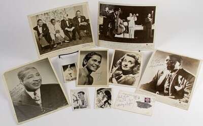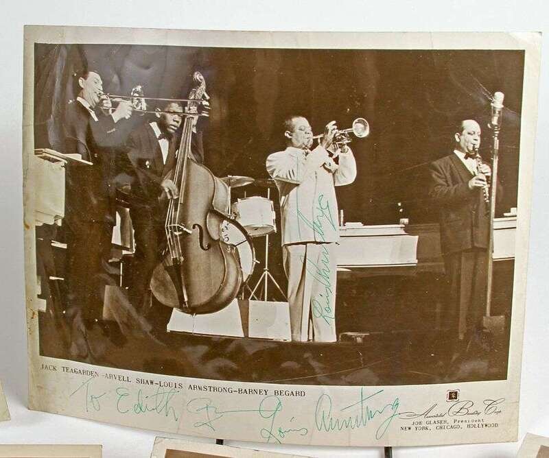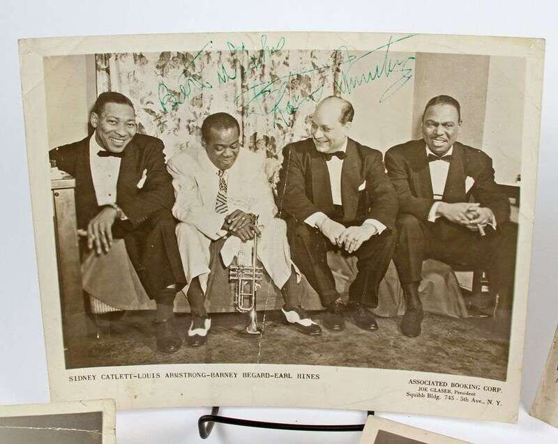 Autograph Material - American Jazz Musicians & Other Performers: Photo signed & inscribed. Armstrong, Louis. Silver print, 8 x 10 in; 203 x 254 mm; vertical crease, other light wear. In green ink. Seated backstage, in repose with Sidney Catlett, Barney Begard & Earl Hines. * Photo signed & inscribed. Armstrong, Louis. Ca 1955. Silver print, 8 x 10 in; 203 x 254 mm; some light creasing. Inscribed & signed twice in green ink. Performing with Jack Tegarden, Arvell Shaw & Barney Begard. * Photo signed & inscribed. Catlett, Sidney. Ca 1955. 10 x 8 in; 254 x 203 mm; minor creasing. Photo signed & inscribed. Johnson, Lonnie. 1954. 10 x 8 in; 254 x 203 mm; creased. * Photo postcard signed. Mikey & Sylvia. 1957. * Lot also includes photos signed by Bette Davis, Sabu, Don Ameche; proxy signatures of Erol Flyn & Sonja Henie.