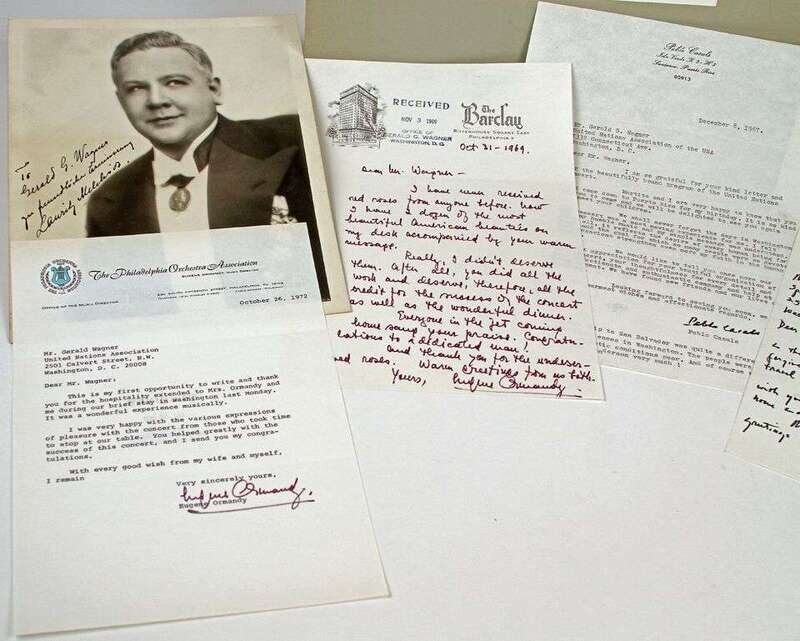 Autograph Material - Classical Musicians, Singers, &C: Casals, Pablo. Photo signed. 1967. Silver print bust portrait, 10 x 8in, signed below image. * _ _. Typed letter signed. Santurce, Dec 8, 1967. 1p, 4to. To Gerald G. Wagner. * Cliburn, Van. Autograph letter signed. Nov 21, 1975. 1p, 4to. To Gerald G. Wagner. * Flagstad, Kristen. Photo signed & inscr. Silver print bust portrait, 10 x 8in. Green ink, starting to fade. * Melchoir, Laritz. Photo signed & inscr. Silver print, 10 x 8in. * Ormandy, Eugene. Autograph letter signed. Philadelphia: The Barclay, Oct 31, 1969. 1p, 4to. To [Gerald G.] Wagner, on Ormandy's letterhead with Wagner ink received stamp. * _ _. Typed letter signed. Philadlephia, Oct 26, 1972. 1p, 4to. To Gerald Wagner, on Philadelphia Orchestra letterhead.