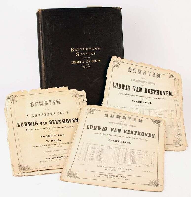 (Leschetizky, Theodor.) Beethoven, Ludwig van. Sonaten fur das Pianoforte Solo. Wolfenbuttel, n.d. [ca 1870]. Edited by Franz Liszt. Nos 1-32. Folio; disbound, scattered light wear & tears, lacking title-page for no 19. With scattered pencil fingering annotations strongly attributed to Leschetizky. * Beethoven's Sonatas. Boston, 1876. Edited by Hans von Bulow & Sigmund Lebert. Vol 2 (of 2) only. Sonatas 18-32 + Sonatine 33 & 34. Orig cloth. Engraved throughout. Sold with all faults.