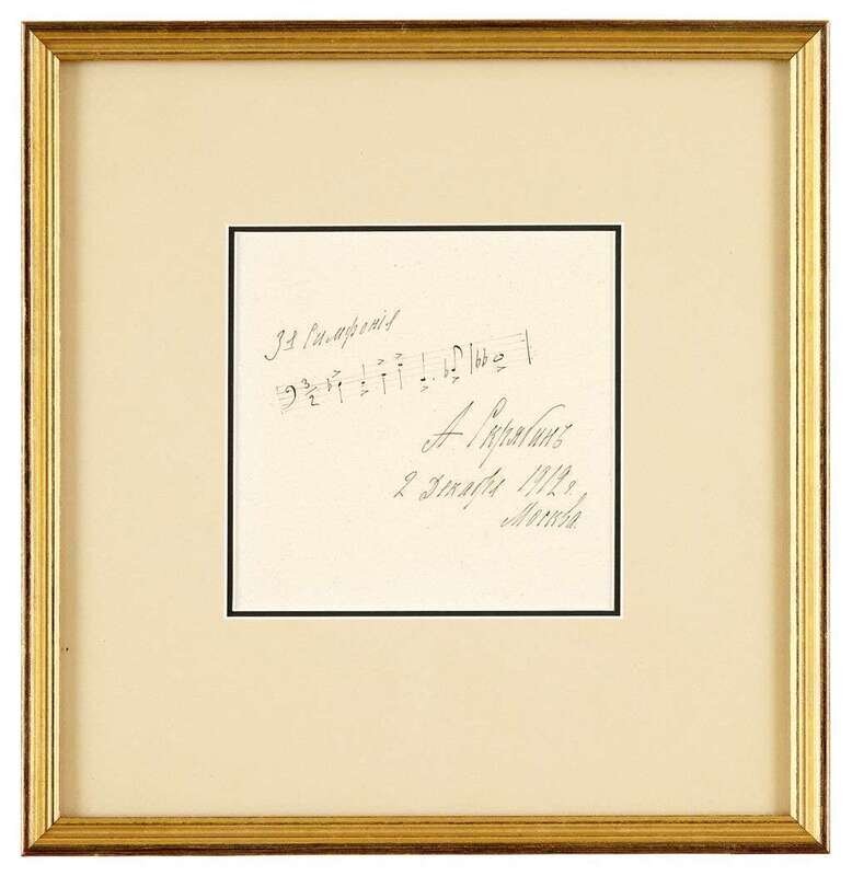 Autograph Music Quotation Signed, Inscribed & Dated. Scriabin, Alexander. Moscow, Dec 2, 1912. 2 bars from his 3rd symphony, on hand-drawn stave. 1p, 4to. Framed. Clean, clear & attractive.