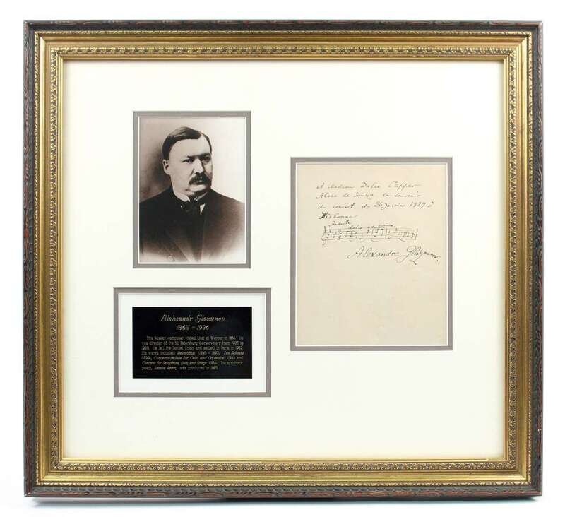 Autograph Music Quotation Signed, Inscribed & Dated. Glazunov, Alexander. N.p., Jan 26, 1929. 2 bars, on hand-drawn stave. 1p, 4to. Framed. Clean, clear & attractive.
