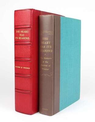 Windsor, Duchess of. The Heart Has Its Reasons. New York: David McKay, [1956]. 1st American edition? 8vo, orig two-tone cloth; minor wear. Presentation copy inscr to Jane Engelhard, dated "April 21st," & signed by the Duchess of Windsor on half-title, additionally inscr & signed "Wallis" on dedication page. Tight, bright copy in custom 1/2 morocco & cloth case with cloth chemise.